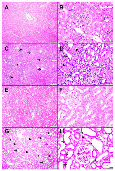 Histological features in the G-NT and G-HT groups. (A,B) the right NOK in the G-NT showing normal kidney architecture and histology with no dilated tubules, tubular atrophy, interstitial fibrosis, or interstitial mononuclear cellular infiltrate). (C,D) the left POK in the G-NT, which shows focal areas of tubular dilatation (thin arrow), and tubular atrophy (arrowhead). (E,F) the right NOK in the G-HT with normal kidney architecture and histology (no dilated tubules, tubular atrophy, interstitial fibrosis or interstitial mononuclear cellular infiltrate). (G,H) The left POK in the G-NT shows focal areas of tubular dilatation (thin arrow) and tubular atrophy (arrowhead). The white bar at the bottom right corner of each sub-figure represents a measurement scale. It measures 200 µm in (A,C,E,G) and 50 µm in (B,D,F,H).