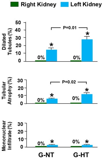 In both groups (G-NT and G-HT), the right NOK had normal architecture and histology (no dilated tubules, tubular atrophy, or interstitial mononuclear cellular infiltrate; score 0 for all) (Figure 6 and Figure 7). The left POK in both groups showed significant histological abnormalities. In the G-NT, the POK showed foci of tubular dilatation (14.38 ± 2.51; score = 1), tubular atrophy (5.94 ± 0.64; score = 1) and interstitial mononuclear infiltrate (2.02 ± 0.25; score= 1) (Figure 6 and Figure 7). Similarly, the POK in the G-HT showed tubular dilatation (27.72 ± 4.21; score = 2), tubular atrophy (11.62± 2.30; score = 1) and an interstitial mononuclear infiltrate (2.08 ± 0.28; score = 1) (Figure 6 and Figure 7). The degree of both tubular dilatation and tubular atrophy in the POK in the G-HT was significantly greater than that observed in the POK in the G-NT (p = 0.01 and p = 0.02, respectively, Figure 7).