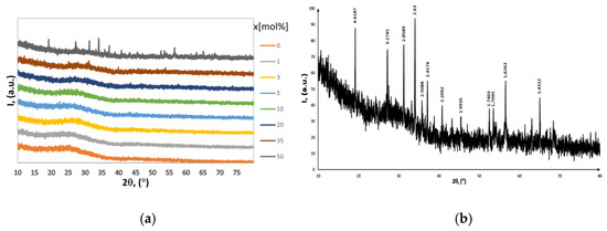 The X-ray powder diffraction pattern for x(Fe2O3∙V2O5)∙(100 − x)[P2O5∙CaO] glass systems are presented in Figure 1a,b. It is observed that apart from sample x = 50 mol%, all the other samples do not show characteristic diffraction peaks for crystalline phases, these being in an amorphous state. The diffraction lines for sample x = 50mol% (Figure 1b) are attributed to the crystalline phase V3O5 (PDF: 72-0524), which crystallizes in the monoclinic system having the space group Cc and the following lattice parameters: a = 9.98 Å, b = 5.03 Å, c = 9.84 Å, and β = 138.80. For all other samples with 0 ≤ x < 50 mol%, it can be noted that they each have a diffraction halo characteristic for the amorphous phase, which reflects the local order. The location of this broadening halo is difficult to determine precisely, but it can be stated that the position of its maximum moves to bigger angles when the sample changes from x = 0, 1, 3, 5, 10, 20, 35 mol%.
