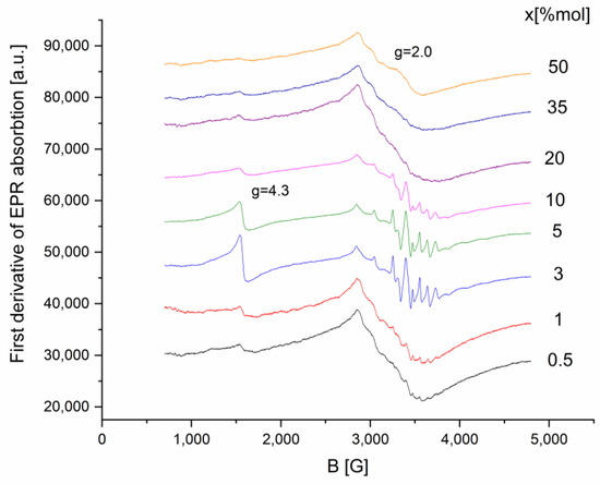 The glass systems x(Fe2O3∙V2O5)∙(100 − x)[P2O5∙CaO] were investigated by applying the EPR technique for x values in the range 0–50 mol%. The EPR spectrum of the prepared samples is presented in Figure 2.