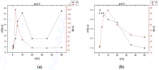 The increase in the concentration of Fe and V ions in the system can explain the J = f(x) dependence. The increase in the intensity of the resonance line (J) in the low concentration range 0–5%, (Figure 3a) and 0–10% (Figure 3b) indicates that the number of absorption centers is increasing. The decrease of J in the concentration range 5–50% (Figure 3a) and 10–50% (Figure 3b) shows the formation of iron and vanadium clusters.