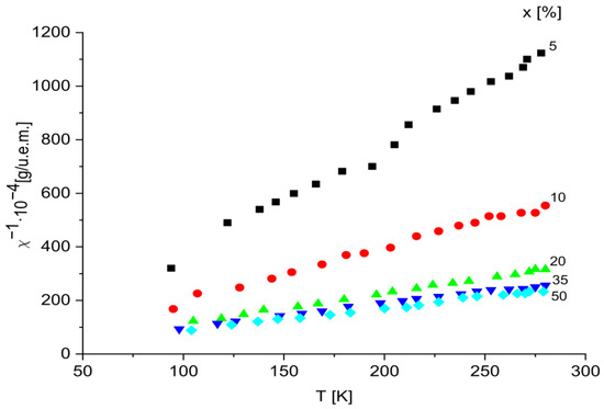 The correlation between temperature and the reciprocal magnetic susceptibility for the glass samples with x varying in the range 0 < x < 50 mol% is presented in Figure 4.