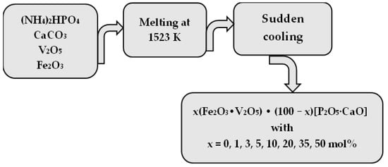 Glasses of the x(Fe2O3∙V2O5)∙(100 − x)[P2O5∙CaO] system were prepared. For the systems studied, reagent grade purity substances were used for analysis. Samples were obtained by a proportional weighing of components, mixed, and melted in sintered corundum crucibles at 1523 K for a 5 min timeframe, and sudden cooling (Figure 5). Eight samples of x(Fe2O3∙V2O5) ∙ (100 − x)[CaO∙Li2O] with x = 0, 1, 3, 5, 10, 20, 35 mol% were obtained.