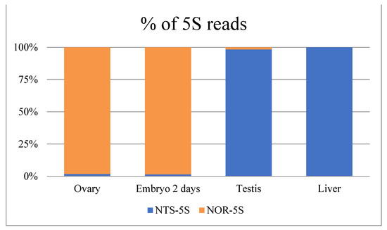 This three nucleotide difference was used to discriminate between the closely related NTS-5S and NOR-5S rRNA variants in the nototheniids. We analysed the Patagonian toothfish transcriptome data of NCBI BioProjects PRJNA511578 (Figure 3) and PRJNA864592 (Figure S4) to identify the representation of NTS-5S and NOR-5S rRNAs in different tissues. It should be noted that rRNAs are removed in the course of routine transcriptomic analysis, so the expression of 5S rRNA variants may be underestimated. However, an abundance of NOR-5S transcripts was found only in the ovary and early embryo, being practically absent in the testis and adult somatic tissues (Figure 3 and Figure S4). These results are very similar to the findings obtained in turtles Mauremys reevesii and Trachemys scripta, where NOR-5S rRNAs were detected in ovary transcriptome and in oocytes by RT-PCR, respectively [38]. The predominant NOR-5S rRNA in toothfish ovaries and early embryos is considered to be maternal 5S rRNA involved in early development.