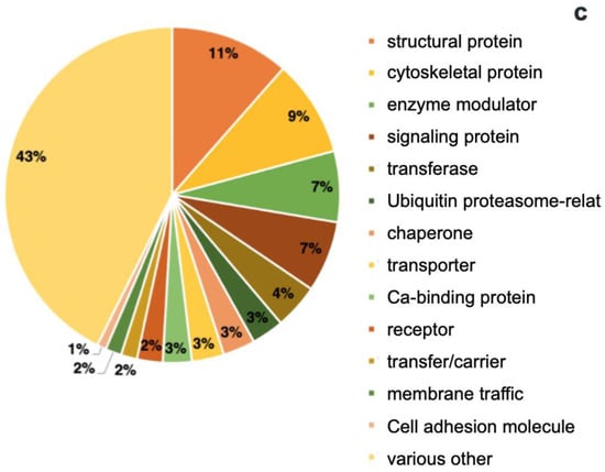 As shown in the heat map in Figure 1b, using the selected experimental design, we found a set of EphB4 intracellular interactors in MSTO211H to increase their binding to EphB4 upon IGF-II signal deprivation, while other interactors had an opposite trend, allowing us to further narrow our search and directing the following confirmatory approach. Panther software v 11 analysis of the dataset is conveyed in Figure 1c. Along with a number of structural and cytoskeletal proteins, this approach identified signaling proteins (7%), enzyme modulators (7%), transferases (4%), ubiquitin/proteasome-related factors (3%), chaperones (3%), transporters (3%), calcium-binding proteins (3%), receptors (2%), membrane trafficking proteins (2%), transfer/carriers (2%), and cell adhesion molecules (0.1%). We then focused on the identified ubiquitin-regulated components associated with EphB4, namely, an E1 ligase (UBA1), an E2 ligase (UBE2N), and the putative E3 ligase (DTX3) along with a chaperon (cdc48/p97), which was due to their potential role as specific mediators of EphB4 protein degradation in response to IGF-II-deprivation. Cdc48/p97 is a selective scaffold/scavenging chaperone and triple ATPase/unfoldase involved in the extraction and degradation of ubiquitinated proteins [,,]. To strengthen its specific involvement with the other ubiquitin-related components identified through mass spectrometry (Table 1), we performed a database search (UniProt KB) [,] for previously described cdc48/p97 interactions which could provide a mechanistic hypothesis for EphB4 protein rapid degradation upon IGF-II signal deprivation. The UniProt database search for proteins with potential involvement in the observed mechanism confirmed Cdc48/p97 (known as Valosin-containing protein, or VCP) as a specific interactor, as it was previously found to interact independently with both UBE2N and DTX3L, a DTX3-related gene.