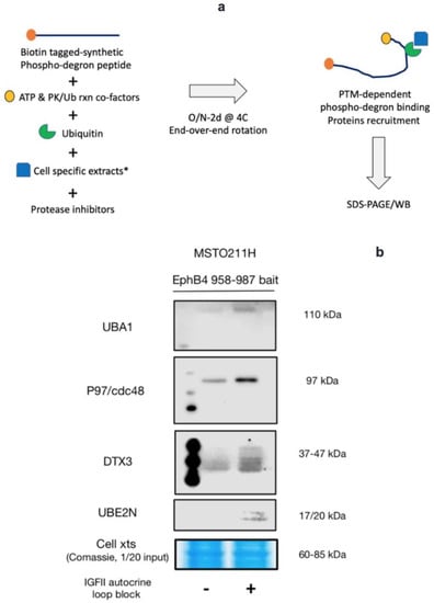 A DTX3-UBE2N-UBA1-Cdc48/p97 protein complex docking to the IGF-II signal-deprived EphB4 Phospho-Degron/PDZ C-terminal region. (a) Schematics of the PTM-enhanced EphB4-C-tail pull-down assay. (*) Asterisk in 2a points at the in vivo IGF-II conditional block treatment; (b) ability of EphB4 c-Tail to recruit UBA1, UBE2N, DTX3, and p97/cdc48 from MSTO211H lysates following ex vivo autocrine IGF-II loop neutralization.