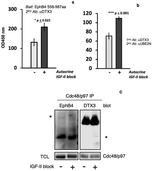 In order to further validate and strengthen the proteomic findings and based upon our previous demonstration of a consensual higher ubiquitination level associated to the rapid EphB4 degradation in cancer cells [], we studied the effect of the autocrine IGF-II signal on the specific recruitment of the proteomic-identified factors using a synthetically generated and tagged EphB4 c-tail. This EphB4 region was obtained by peptide synthesis and was covalently bound to biotin on its N-terminal side to allow Streptavidin beads pull down (see methods). The use of a synthetic EphB4 tagged peptide as bait in order to study the IGF-II regulated recruitment of the ubiquitin-related factors was chosen in order to overcome the stoichiometric limitation of EphB4 rapid degradation observed with its native protein upon IGF-II blockade. Therefore, we focused on the proteins represented in the proteomic dataset involved in the EphB4 ubiquitin-regulated degradation process (Table 1). In order to maximize both phosphorylative and ubiquitinylation events responsible for the ex vivo degradation complex formation, we designed a novel assay which combined both in vivo and in vitro optimized conditions. To this end, we combined the synthesized biotin-tagged EphB4 C-Degron/PDZ-binding domain as substrate/bait in a cell-free reaction against in vivo treated cell extracts. We further included steps, conditions, and reagents in the in vitro workflow to enhance native enzymatic priming by both endogenous ubiquitin ligases as well as by phospho-Tyr/Thr/Ser kinases present in the MSTO211H extracts obtained from cells upon conditional IGF-II signal block treatment. In this assay, the extracts served both as a source of enzymatic activities (kinases, Ub-ligases, etc.) as well as a source of endogenous complex proteins interacting with the EphB4 c-tail spanning EphB4 region 958–987. This approach (PTM-enhanced protein pull-down) allowed us to study the native components involved, similarly to a co-immunoprecipitation assay, except without the limitations linked to the binding of native proteins to regions of the target protein not of interest (e.g., in our case, the EphB4 extracellular domain). Using this strategy (see the assay workflow in Figure 2a and method description), we tested the IGF-II dependence of UBA1, UBE2N, UBE2L3, DTX3, and Cdc48/p97 binding to the EphB4 C-Degron/PDZ-domain in MSTO211H cells. The results of this substrate/bait study are summarized in Figure 2b. Specifically, it was found that upon autocrine IGF-II signal deprivation, UBA1, DTX3, UBE2N, and Cdc48/p97 binding to EphB4′s 30 C-terminus amino acids which, we have previously found to bear a UBX-like motif contiguous to its PDZ-binding tail [], was markedly increased. Interestingly, in the case of DTX3 a laddering effect was observed upon IGF-II block on the PTM-enhanced pull down, which was likely due to multiple post-translational modification in its protein occurring in response to IGF-II signal deprivation. The specific involvement of the putative E3 ligase DTX3 in the EphB4 degradation complex was further confirmed by bait-capture ELISA and by co-immunoprecipitation, as shown in Figure 3. This approach confirmed the association of DTX3 with the individually isolated complex components as well as the dependency of such binding from the autocrine IGF-II stimulatory status (Figure 3a–c).