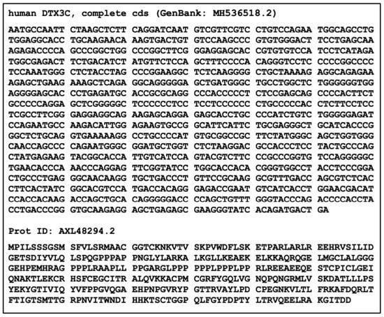 Considering the different response to the autocrine IGFII block observed between MSTO211H and HelaS3 [] and due to the fact that DTX3 is known to exist in two isoforms (known as DTX3a and DTX3b) differing in a short aa stretch at the N-terminus end (corresponding to 10 aa from exon 1 in isoform b replaced by 7 aa of the alternatively spliced exon 2 in isoform (a), we decided to further look at this E3 ligase expression in both MSTO211H and HelaS3 as a potential molecular discriminant for the previously observed differential EphB4 degradation behavior between these two cell lines. Specifically, we, hypothesized that different isoform expression between MSTO211H and HelaS3 could underlie the different responsivity to IGF-II autocrine stimuli. To test this hypothesis, we designed DTX3 isoform-specific primers at the level of the predicted coding sequence near the N-terminus end for each of the two DTX3 known isoforms (DTX3a and b) and performed parallel retro-transcription starting from total RNA isolated in MSTO211H and HelaS3 cells, respectively. This was followed by PCR amplification of the resulting cDNA using the same isoform-specific forward primers for either the a or b isoform paired with a common reverse primer spanning a shared gene region at about 300bp within the DTX3 coding sequence (Figure 5). To confirm the specificity of these DTX3 isoform specific primers, we tested them on a DTX3a plasmidic gene clone obtained from Harvard Medical School (clone HsCD00422152). As expected for the control plasmid, the DTX3a amplicon was observed only in the reaction with the DTX3a isoform-specific primers (Figure 5b), while no amplicon was produced when the DTX3b-forward primer was used. The results of this strategy on MSTO211H and HelaS3 are summarized in Figure 5. While HelaS3 clearly was shown to express a DTX3a isoform, interestingly, MSTO211H displayed both the alternatively spliced exons, raising the possibility of the underlying nature of the transcript possibly being consistent with co-expression of both isoforms in MSTO211H. In order to further confirm the identity of the DTX3 isoform sequence, we used Sanger sequencing of the PCR product (as visualized in the gel) in MSTO211H. The analysis of our sequenced transcript using the ExPASy Translate tool [] unexpectedly revealed an amino acid sequence containing the first nine N-terminal amino acids of DTX3b with a deletion of the corresponding Lysine in position 10, immediately followed by seven amino acids corresponding to the N-terminal portion of DTX3a contiguous and in frame with the remaining part of the DTX3 protein sequence common to both isoforms, suggesting possible exon retention. Further analysis of our cDNA variant against the known human DTX3 gene (ENSG00000178498) and corresponding transcript (ENST00000337737.7) from Ensembl (European Bioinformatics Institute (EMBL-EBI) revealed a g>a mis-sense (transition) mutation corresponding to the DTX3 genomic position on chromosome 12 (NC_000012.42, genomic position 12:57606864) and position 29 of our cDNA variant. We next determined whether this transition from g>a could result in an alteration in splicing, for which we used the splice site prediction program Human Splicing Finder v3.1 (INSERM, 2018) []. Mutational analysis of the known human DTX3 gene from Ensembl in the region surrounding the N terminus revealed alteration of an exonic ESE site associated with sequence mutation of the corresponding splice site at the g>a transition in our sequence and at the corresponding position in the reference. Analysis of the COSMIC database revealed no known variants at genomic position 12:57606864, nor between 12:57606861 and 12:57606867. The g>a transition apparently resulted in the observed deletion of lysine (K) in position 10 of DTX3b and the retention of intron 2 (DTX3a), supporting the identification of a new variant. The result of this analysis (summarized in Figure 5) confirmed that the atypical DTX3b primer-amplified variant cloned in MSTO211H was indeed a new N-Terminal DTX3 isoform, which we called DTX3c and submitted accordingly to the NCBI GenBank repository. A reference number has been assigned to the newly submitted partial sequence (BankIt2126934 DTX3C MH536518), and accession details can be found in the NCBI public database []. A sequence comparison between the three isoforms is provided graphically and through NCBI BLAST multiple alignment in Figure 5d. In order to confirm the full sequence nature of the newly discovered N-terminal variant, we obtained the full DTX3 transcript’s cds upon PCR amplification and further submitted the complete sequence to GenBank, which assigned an updated reference ID number (MH536518.2) (Figure 6).