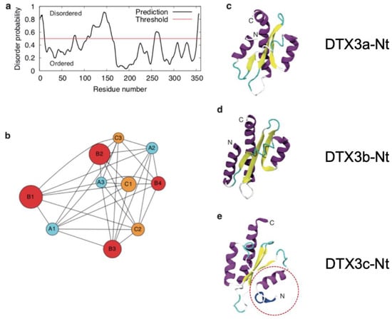 Tridimensional modeling of DTX3c N-terminal domain and comparison with previously identified Isoforms. (a) Disorder prediction graph of DTX3c N-terminal region; (b) cluster representation for probable conformations and atomic distance of the models generated for the DTX3c N-T region; (c) N-Terminal domain rendering for DTX3a; (d) DTX3b; (e) DTX3c; (f) (A1−C3) additional spatial distribution renderings of the three N-terminal domains of DTX3, with (A1−A3) and (B1−B4) displaying close 3D resemblance compared to DTX3c (C1−C3). The results suggest that DTX3c has a unique spatial distribution, implying different biological activities such as EphB4 degradation efficiency. For explanation of red dotted circles, see text.