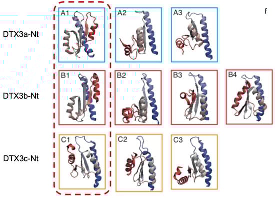 2.5. Three-Dimensional Modelling of E3 Ligase DTX3 N-Terminus Domain Variants Disclose Different Preferential Folding for DTX3c