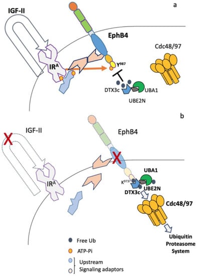 Proposed model for EphB4 over-expression in cancer via IGF-II/IR-A autocrine stimuli. The cumulative scenario deriving from the present work and our previously published work [] allows us to propose a mechanistic model in which the IGF-II/IR-A autocrine signal is a key condition for EphB4 overexpression in those cells co-expressing the factors described herein. (a) Under such self-stimulated conditions (such as those in cancers secreting IGF-II), the IR-A tyrosine kinase can phosphorylate EphB4 on its c-terminal Tyr987 residue. Such phosphorylation has an inhibitory role on EphB4 C-terminal degron recruitment by DTX3c (E3-ligase), causing an extended expression half-life of EphB4 and its cancer-promoting functions. (b) Upon IGF-II signal neutralization, EphB4 Tyr987 is rapidly dephosphorylated and its C-tail is ubiquitinylated, allowing DTX3c and its associated degradation partners to exert their UPS-mediated role.