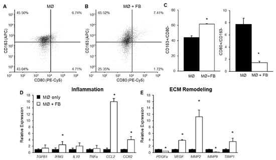 THP-1-derived macrophage phenotype following indirect co-culture with mammary fibroblasts. PMA-treated THP-1 derived macrophages (0.5 × 106 cells/mL) were cultured alone (MØ only), or indirectly with primary mammary fibroblasts (FB + MØ) for 72 h. Cell surface marker expression of CD163 and CD80 on THP-1 derived macrophages were detected using flow cytometry in (A) macrophage only cultures (n = 6) and (B) macrophages in indirect co-culture with primary mammary fibroblasts (n = 6). (C) The percentage of viable cells, which are CD163+/CD80− or CD80+/CD163− in each culture condition. Expression of genes associated with (D) inflammatory and (E) extracellular matrix (ECM) remodelling were assessed through RT-PCR. Gene expression was normalised to the housekeeping gene HPRT1. Results are presented relative to macrophage-only cultures. Data presented as mean + SEM. Statistical analysis was performed using a linear mixed effects model with Tukey’s post hoc comparison. Statistical significance is indicated by * when p < 0.05.