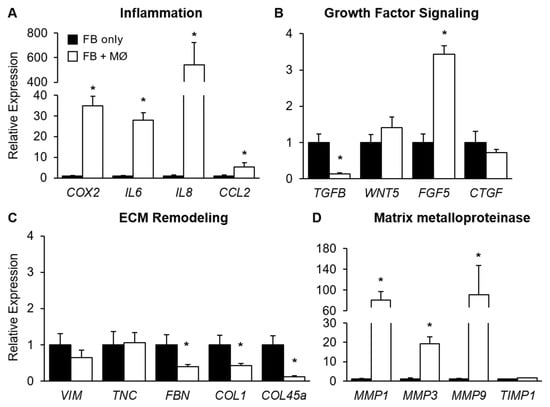 Gene expression in mammary fibroblasts following indirect co-culture with THP-1 derived macrophages. Primary mammary fibroblasts were cultured alone (FB only), or indirectly with PMA-treated THP-1-derived macrophages (0.5 × 106 cells/mL) (FB + MØ) for 72 h. Expression of genes associated with (A) inflammation, (B) growth factor signalling, (C) extracellular matrix remodelling, and (D) matrix metalloproteinase function were assessed through RT-PCR. Gene expression was normalised to the housekeeping gene HPRT1. Results are presented relative to fibroblasts-only cultures. All data mean + SEM. Statistical analysis was performed using a linear mixed effects model with Tukey’s post hoc comparison. Statistical significance is indicated by * when p < 0.05.