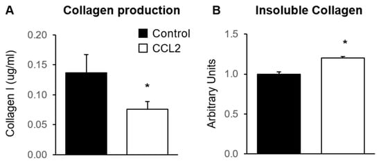 To investigate the effect of CCL2 on collagen production in primary mammary fibroblasts, fibroblasts were cultured in the presence or absence of 500 ng/mL of CCL2 for 72 h (n = 6). Collagen was measured by ELISA to detect production of soluble collagen I, and Sirius red dye was used to measure insoluble collagen fibres (n = 6). The results were adjusted to be relative to fibroblast only controls, where the average level of collagen production was equal to 1 arbitrary unit. Collagen I production was significantly decreased in fibroblasts treated with CCL2 (0.56 ± 0.09 µg/mL) compared to untreated controls (1 ± 0.22 µg/mL) (p < 0.05) (Figure 3A). However, the abundance of insoluble collagen fibres, as measured with Sirius red dye, was significantly increased in fibroblasts treated with CCL2 (1.21 ± 0.07 arbitrary units) compared to untreated controls (1 ± 0.08 arbitrary units) (p < 0.05) (Figure 3B).