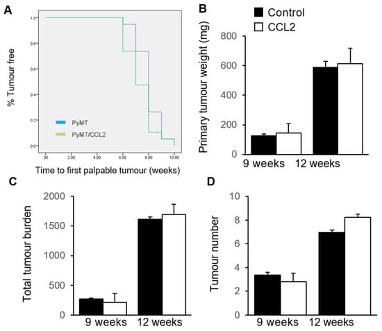 At the time of sacrifice, both the primary tumour and all other tumours were dissected and weighed to investigate the tumour burden. At 9 weeks of age, the average primary tumour weight was 124.28 ± 15.48 mg for PyMT controls and 145.33 ± 41.62 mg in PyMT/CCL2 mice. At 12 weeks of age, the average primary tumour weight was 588.39 ± 64.30 mg in PyMT control mice and 613.29 ± 104.01 mg in PyMT/CCL2 mice. There was no significant difference in primary tumour weight between PyMT/CCL2 and PyMT control mice at 9 (p = 0.586) and 12 (p = 0.885) weeks of age (Figure 4B). The total tumour burden was measured as the total weight of all mammary tumours in each mouse. The average total tumour burden at 9 weeks of age was 268.67 ± 19.04 mg for PyMT controls and 211.93 ± 45.43 mg for PyMT/CCL2 mice. The average total tumour burden at 12 weeks of age was 1611.79 ± 154.57 mg for PyMT controls and 1695 ± 169.46 mg in PyMT/CCL2 mice. There was no significant difference in the total tumour burden between PyMT/CCL2 and PyMT control mice at 9 (p = 0.187) and 12 (p = 0.706) weeks of age (Figure 4C). The average number of tumours in PyMT control mice was 3.36 ± 0.26 tumours and in PyMT/CCL2 mice, there were 2.8 ± 0.21 tumours at 9 weeks of age. At 12 weeks of age, the average number of tumours in PyMT control mice was 6.95 ± 0.73 tumours, and in PyMT/CCL2 mice there were 8.24 ± 0.26 tumours. There was no significant difference in the tumour number between PyMT and PyMT/CCL2 mice at 9 (p = 0.187) and 12 (p = 0.364) weeks of age (Figure 4D).