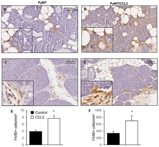 To investigate the effect of CCL2 on macrophage infiltration during tumorigenesis in the Mmtv-PyMT mouse model, fourth pair mammary glands were dissected at 9 weeks’ age from PyMT and PyMT/CCL2 and formalin fixed paraffin embedded tissue sections were stained with pan macrophage marker F4/80. Three areas of non-palpable early tumorigenesis were randomly identified, with the assessor blinded to mouse genotype, in each mammary gland and the number of F4/80+ cells were manually counted (Figure 6A–D). In PyMT mice, the average number of F4/80 stained macrophages per mm2 was 3.87 ± 0.413, and in PyMT/CCL2 mice there was an average of 7.67 ± 0.961 macrophages per mm2. There were significantly more macrophages infiltrating early tumorigenic tissue in PyMT/CCL2 mice compared to PyMT controls at 9 weeks of age (p < 0.001) (Figure 6E,F). Palpable primary tumours collected from PyMT control mice at 9 weeks of age had an average of 497.54 ± 85.02 macrophages per mm2, and PyMT/CCL2 mice had an average of 683.00 ± 97.81 macrophages per mm2 (Figure 6B,D,F).