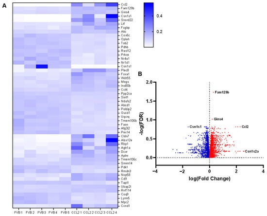 To investigate the effect of CCL2 on mammary gland global gene expression, mammary glands from Mmtv-Ccl2 and FVB control mice were collected at 12 weeks of age and analysed for global gene expression by RNAseq. These were healthy normal mammary glands, not tumorigenic, as these mice did not carry the PyMT oncogene. The results of the RNAseq analysis showed 6149 genes that were differentially expressed in mammary glands of Mmtv-Ccl2 mice. The differentially expressed genes are represented by heat-map (top 50 genes) and volcano plot (Figure 7A,B). The most differentially expressed gene between Mmtv-Ccl2 and wild-type mice is CCL2, in agreement with the genotype of the transgenic model.