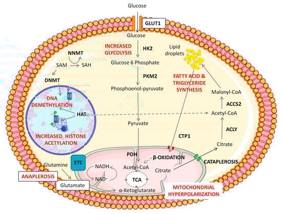 We are only beginning to uncover the mechanisms whereby cellular metabolism influences stem cell fate, but this includes changes at the epigenetic level, which in turn affect gene expression. According to these findings, some metabolic intermediates may contribute to the regulation of chromatin accessibility. Several studies place glycolysis as a crucial producer of metabolic intermediates necessary to produce new biomass to sustain cell growth and division and as a source of small organic methyl and acetyl groups required to perform epigenetic changes [46,52,65,66,67]. Research over the last decade has identified essential roles for small organic metabolites in the regulation of epigenetics and transcription, including S-adenosyl methionine (SAM) produced via the one-carbon cycle, Acetyl-CoA from glycolysis, as well as α-ketoglutarate (α-KG), nicotine adenine dinucleotide (NAD) and flavin adenine dinucleotide (FAD) from the Tricarboxylic Acid Cycle (or TCA cycle) [68,69,70]. Increased SAM levels lead to higher histone methylation, whereas increased ascorbate and α-ketoglutarate levels are related to histone demethylation and the maintenance of pluripotency [68,70]. N-methyl transferase enzyme (NNMT) controls SAM–SAH (S-adenosyl homocysteine) conversion, which critically regulates SAM levels, and hence the activity of DNA and histone methylases [69] (Figure 2). Interestingly, α-ketoglutarate, a metabolite derived from glutamine, is described to be a substrate for several histone demethylases, and the Tet family of enzymes that are involved in histone and DNA demethylation to maintain a relaxed chromatin state [70]. Acetyl-CoA is a versatile metabolite that can contribute to the initiation of the TCA cycle, the “de novo” biosynthesis of lipids, and the acetylation of specific amino-acid residues (predominantly lysine) on histone and non-histone proteins [71]. The mutual dependence between Acetyl-CoA and histone acetylation has been previously described in many different types of stem cells such as ESCs [72], skeletal muscle stem cells [73], and DPSCs [74,75]. Accordingly, the block of Acetyl-CoA production causes a reduction of histone acetylation and the onset of cell differentiation [52,72,76]. It has been described that the addition of Acetyl-CoA prevented histone deacetylation and delayed differentiation of ESCs in its initial stages [72]. The specific mechanisms by which metabolism can influence stem cell fate are still not fully understood, but it is known that the accumulation of some specific metabolites such as reactive oxygen species (ROS) and SAM can trigger an epigenetic remodeling, thus influencing stem cell fate [68,77]. Accordingly, some metabolic intermediates may contribute to the regulation of chromatin remodeling during cell reprogramming. This is crucial to understand the physiological events taking place during cell reprogramming, with a view to inducing a safe and controlled de-differentiation of cells to use in future cell therapy.