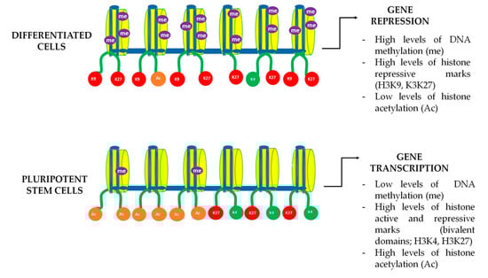 In the early stages of embryonic development pluripotency core factor genes remain active, but at later stages of cell differentiation they gradually become silenced, and cell type-specific genes are turned on instead. This is the result of the expression of specific transcription factors associated with chromatin modifications and remodeling. Chromatin in ESCs displays an open conformation featured by high levels of acetylated histones, and the presence of bivalent gene promoters containing both enhancing and repressing histone methylation tags, enabling a rapid expression of lineage-specific genes during differentiation [55]. DNA methylation at CpG islands is another important epigenetic silencer mechanism [56,57]. The silencing of certain genes by DNA methylation is required for the induction of differentiation of ESCs whereas DNA hypomethylation is required for the maintenance of cell stemness [58]. Classical pluripotency core factors OCT4, CMYC, NANOG, SOX2, KLF4, and LIN28 have been shown to interact with and regulate the epigenetic landscape [59,60]. For instance, hypomethylation of the OCT4 gene promoter is known to enhance its expression, and OCT4 may in turn interact with several polycomb group proteins to regulate the histone methylation status of other genes and pluripotency factors such as NANOG [61,62,63]. A high expression of pluripotency core factors induces somatic cell dedifferentiation, making DNA more accessible and facilitating the expression of stemness-related genes [63,64].