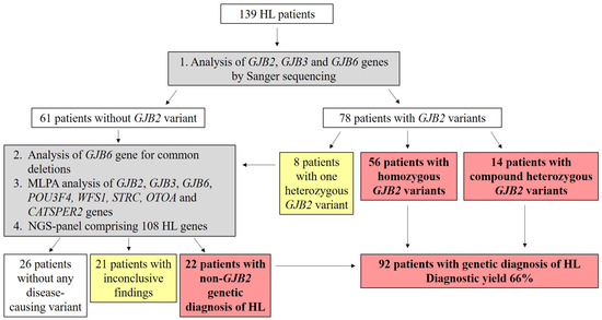 Using our stepwise testing approach (Figure 1), genetic diagnosis was possible for 92 patients, corresponding to a total diagnostic yield of 66% (92/139). The diagnostic yield for Sanger sequencing and MLPA was 50% (70/139) and the NGS panel identified another 16% (22/139). In the prelingual NSHL group, the diagnostic yield was 73% (76/105) and, for the postlingual NSHL group, 47% (16/34). In 26 cases (19%), no variant was identified (13% (14/105) in the prelingual group and 35% (12/34) in the postlingual group, Figure 2). This difference was statistically significant (p = 0.006674), indicating that it is more likely to establish the genetic diagnosis in prelingual NSHL than in postlingual NSHL patients.
