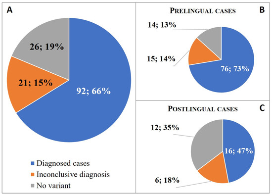 Distribution of diagnosis for patients in the Hungarian NSHL patient cohort. Numbers within the sections of the circular chart: number of patients; percentage of patients. (A) Complete (N = 139); (B) prelingual NSHL (N = 105); and (C) postlingual NSHL (N = 34) cohorts.