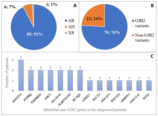 Distribution of inheritance patterns (A), GJB2 (B), and non-GJB2 variants (C) in the Hungarian NSHL patient cohort. Diagnosed patients: N = 92. Numbers within a section of a circular graph indicate the number of patients (percentage of patients). AR: autosomal recessive; AD: autosomal dominant; XR: X-linked recessive.