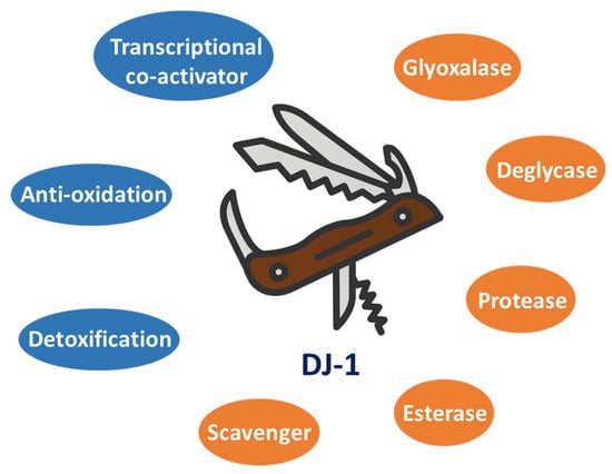 DJ-1 is a Swiss army knife-like protein with diverse functions and plays multiple essential roles in human health and disease states. The representative enzymatic and non-enzymatic activities of DJ-1 are labeled in orange and blue circles, respectively.
