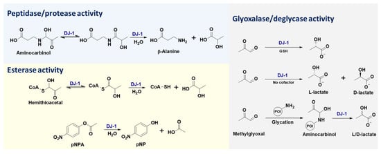 Representative well-established enzymatic activities of DJ-1 [,,]. pNPA: 4-Nitrophenyl acetate; pNP: 4-Nitro-phenoxide; GSH: glutathione; POI: protein of interest.