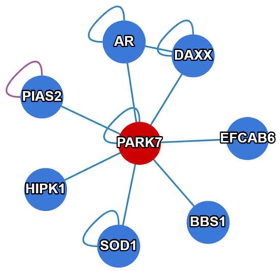 Representative interactome of PARK7 (DJ-1), in addition to those mentioned in this paper (e.g., GAPDH, SREBP, STAT1, NURR1, etc.). The figure was made using the website of the Human Reference Interactome (HuRI) Mapping Project (http://www.interactome-atlas.org; accessed on 30 March 2023).
