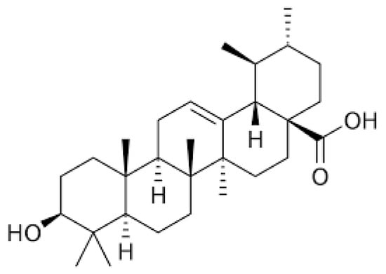 The chemical formula of UA is C30H48O3, and structurally, UA is classified as a pentacyclic triterpenoid (Figure 1). Evidence indicates that UA exhibits anti-inflammatory [30,31], neuroprotective [32,33], antidiabetic [34], and anticancer properties [8,35,36,37].