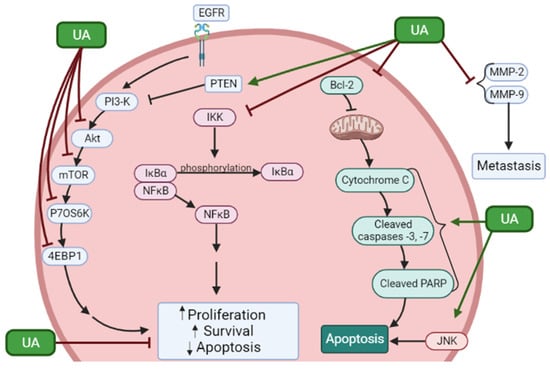 Gai et al. found that treatment of T24 bladder cancer cells with UA resulted in the inhibition of proliferation and induction of apoptosis. Treatment with UA resulted in inhibition of Akt and IκBα–NF-κB signaling, Bcl-2 downregulation, and caspase-3 upregulation [61]. These data showed that UA exerts its pro-apoptotic effect by suppressing Akt/NF-κB signaling in T24 cells (Table 3).