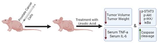 Effects of ursolic acid treatment on prostate cancer in vivo. Mice xenografted with prostate cancer cells and treated with ursolic acid, had reduced tumor volume and weight compared to untreated animals. The overall survival was also increased in UA-treated animals in one study. Ursolic acid treatment reduced the serum levels of TNF-α and IL-6 and the phosphorylation/activation of STAT3, AKT, and IKKα/β in tumor tissues. ↑ = Increased; ↓ = Decreased.