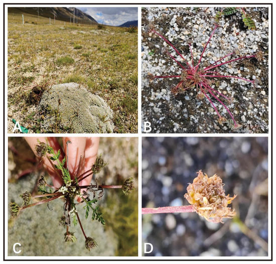 Habitat and morphological features of Ligusticopsis litangensis (A) habitat; (B,C) plant; (D) fruit.