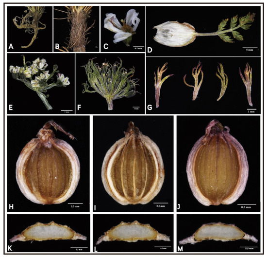 Morphology of Ligusticopsis litangensis (A) root; (B) stem (base); (C) flower; (D) leaf; (E) inflorescence; (F) infructescence; (G) bracteoles; (H–J) oblong-globose fruit; (K–M) mericarp transverse section.