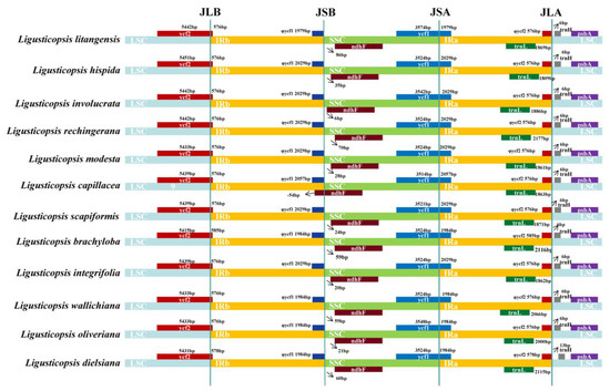 Comparison of LSC, SSC and IR boundary regions in 12 plastomes. The different boxes represent the location of the gene. JLA: the junction of the LSC and IRa. JLB: indicates the junction of the LSC and IRb. JSA: the junction of SSC and IRa. JSB: the junction of SSC and IRb.