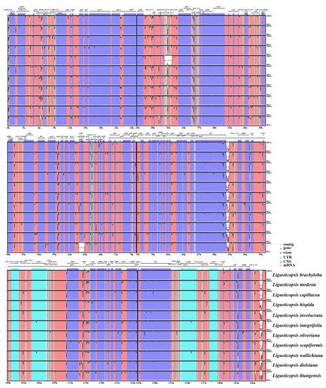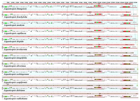 Alignment of the twelve Ligusticopsis plastomes (mauve graphs). Local collinear blocks within each alignment are represented by blocks of the same color connected with lines.