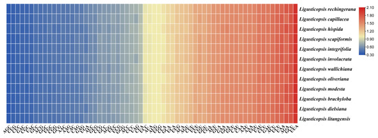 We extracted and linked 53 protein-coding genes from each species to calculate the codon usage frequency of 12 plastomes. The RSCU value is a measure of synonymous codons usage bias in a gene coding sequence, if the RSCU value of a codon is greater than 1.0, it is preferable to use the codon and vice versa. The heatmap shows the codon usage bias is similar and conserved among the 12 species of the genus Ligusticopsis, including the new species. These protein sequences encode 19,909–22,622 codons. Of these, the codon encoding leucine (Leu) has the most protein sequences, while the codon encoding cysteine (Cys) has the least protein sequences (Table S2). In addition, the heatmap shows that the relative synonymous codon usage (RSCU) values of all codons are between 0.34 and 2.00, and about 30 codons have RSCU values greater than 1 (Figure 7). The UAA codon had the highest value in the L. brachyloba plastome (RSCU = 2.0), while the AGC codon had the lowest value in L. capillacea, L. involucrata and L. dielsiana plastomes (RSCU = 0.34). Furthermore, all the amino acids in these 12 plastid sequences except methionine (Met) and tryptophan (Trp) were encoded by two or more codons, indicating a codon bias. Among the three termination codons (TAA, TAG, TGA), the plastomes of these 12 species had the highest RSCU values for the stop codon TAA, all of which ranged from 1.70 to 1.75.