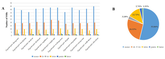 Analyses of simple sequence repeats (SSRs) in twelve plastomes. (A) Numbers of different repeat types; (B) the proportion of different SSR types in total.