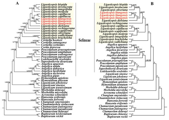 We used 41 ITS sequences and 40 plastomes sequences of Apioideae for the phylogenetic analysis (Table S4). The tree topologies obtained from the ML and BI analyses based on the ITS data and plastid genome data are presented in Figure 9. It is obvious that the topologies obtained from both the ITS and plastid sequences clearly demonstrate that the 12 Ligusticopsis species are clustered into a stable and robust monophyletic clade located within the Selineae (ML/BS ≥ 95, BI/PP ≥ 1.00). Additionally, although the topologies between ITS sequence and plastid genome sequence were slightly different, both robustly supported that three individual sequences of L. litangensis are monophyletic clade and then nested in the Ligusticopsis genus (ML/BS ≥ 95, BI/PP ≥ 0.95).
