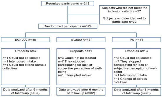 General study flowchart. Abbreviations: EG1000, group supplemented with 1000 mg/day of RV; EG500, group supplemented with 500 mg/day of RV; PG, placebo group.