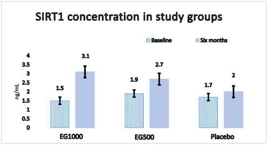 SIRT1 concentration in study groups: baseline and after six months. Data are presented as mean ± SE. A statistically significant increase (1.5 ± 0.15 vs. 3.1 ± 0.20 ng/mL; p < 0.05) in EG1000 is observed after follow-up.