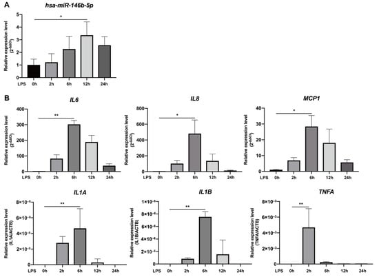 Hsa-miR-146b-5p expression was significantly up-regulated at 12 h after LPS stimulation and decreased thereafter in hDPCs (p < 0.05, Figure 1A). mRNA expression of pro-inflammatory cytokines and chemokines including interleukin 6 (IL6), IL8, monocyte chemotactic protein 1 (MCP1), IL1α (gene symbol IL1A), IL1β (gene symbol IL1B), and tumor necrosis factor alpha (TNFα; gene symbol TNFA) peaked at 2–6 h after LPS stimulation (p < 0.05 or 0.01, Figure 1B), which was earlier than the peak of hsa-miR-146b-5p expression.