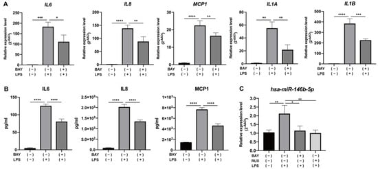 mRNA expression of pro-inflammatory cytokines IL6, IL8, MCP1, IL1A, and IL1B as well as the protein expression of IL6, IL8, and MCP1 was induced by 6 h of LPS stimulation, and was significantly down-regulated by BAY 11-7085, a typical inhibitor of NF-κB (p < 0.05 to 0.0001, Figure 2A,B). The increase in hsa-miR-146b-5p expression induced by 6 h of LPS stimulation was also abolished not only by BAY 11-7085 but also by ruxolitinib, a representative JAK1/2 inhibitor (p < 0.05 or 0.01, Figure 2C).
