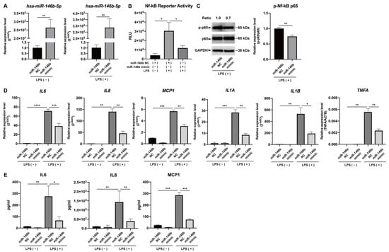 Increased expression of hsa-miR-146b-5p in hDPCs transfected with mirVana miRNA mimic for hsa-miR-146b-5p (miR-146b mimic) was confirmed (p < 0.01, Figure 3A). Promoted NF-κB activity and expression of phosphorylated NF-κB p65 by LPS stimulation were significantly down-regulated by over-expression of miR-146b mimic (p < 0.05 or 0.01, Figure 3B,C), as well as phosphorylated IKKα/β and phosphorylated IκBα (Figure S1). Furthermore, up-regulated mRNA expression of IL6, IL8, MCP1, IL1A, IL1B, and TNFA, as well as protein expression of IL6, IL8, and MCP1, was significantly depressed by over-expression of hsa-miR-146b-5p in LPS-stimulated hDPCs (p < 0.05 to 0.0001, Figure 3D,E).