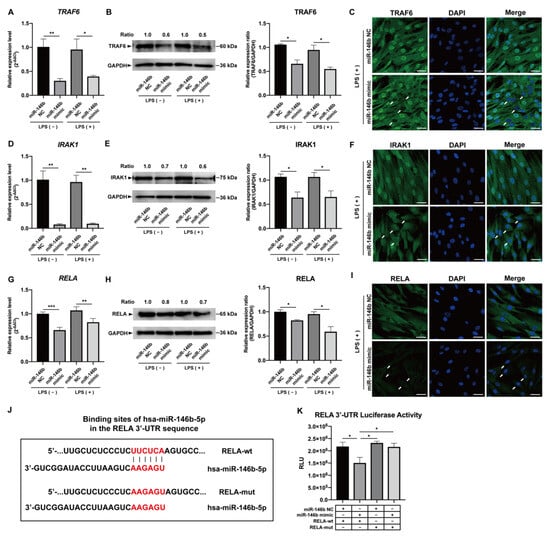 Tumor necrosis factor receptor-associated factor 6 (TRAF6), interleukin-1 receptor-associated kinase 1 (IRAK1), and REL-associated protein (RELA/NF-κB p65) are essential mediators of NF-κB signaling and are the predicted target genes of miR-146b-5p (TargetScanHuman). Over-expression of hsa-miR-146b-5p significantly down-regulated mRNA and protein expression of TRAF6, IRAK1, and RELA in LPS-stimulated hDPCs (p < 0.05 to 0.001, Figure 4A,B,D,E,G,H). Similar down-regulated expression of TRAF6, IRAK1, and RELA in LPS-stimulated hDPCs was confirmed by immunocytological evaluation (Figure 4C,F,I). In addition, mRNA and protein expression of TRAF6, IRAK1, and RELA was independent of the presence of LPS (p > 0.05, Figure 4A,B,D,E,G,H and Figure S2). Furthermore, over-expression of hsa-miR-146b-5p significantly down-regulated the luciferase activity in hDPCs transfected with a reporter vector containing hsa-miR-146b-5p target sequence in the RELA 3′-UTR (p < 0.05, Figure 4J,K), whereas such phenomena were not observed in hDPCs transfected with a reporter vector containing mutated hsa-miR-146b-5p target region in the RELA 3′-UTR (p > 0.05, Figure 4J,K).