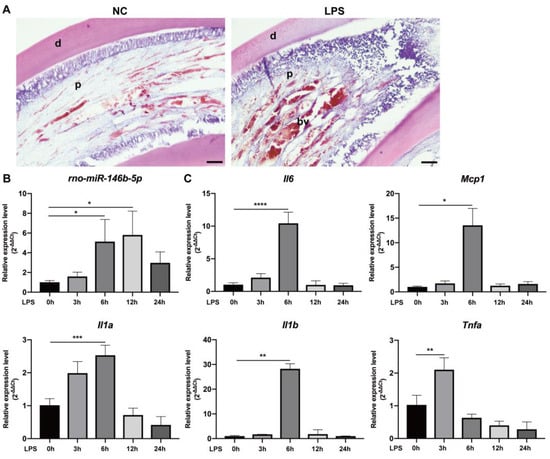 Expression of rno-miR-146b-5p and pro-inflammatory mediator mRNA is up-regulated in experimentally-induced rat pulpitis. (A) Typical inflammation reactions induced by LPS including vasodilatation and infiltration of inflammatory cells were observed in LPS-applied rat incisor pulp tissues (H&E). (B) Expression of rno-miR-146b-5p was significantly up-regulated in rat incisor pulp tissue at 6 h after LPS application and peaked at 12 h (mean ± SD, n = 3). (C) mRNA expression of pro-inflammatory mediators Il6, Mcp1, Il1a, Il1b, and Tnfa was induced by LPS stimulation and peaked at 6 h (Tnfa peaked at 3 h; mean ± SD, n = 3). * p < 0.05, ** p < 0.01, *** p < 0.001, and **** p < 0.0001. LPS: lipopolysaccharide; d: dentin; p: pulp; bv: blood vessel; Scale bars: 150 μm.