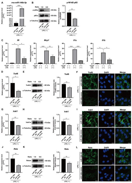 rno-miR-146b-5p mimic down-regulates mRNA expression of pro-inflammatory mediators in LPS-stimulated ex vivo cultured rat incisor pulp tissue. (A) Transfection of rno-miR-146b-5p mimic induced significant up-regulation of rno-miR-146b-5p in LPS-stimulated ex vivo cultured rat incisor pulp tissue (mean ± SD, n = 3). (B) rno-miR-146b-5p mimic significantly down-regulated the phosphorylation of NF-κB p65 in ex vivo cultured rat incisor pulp tissue with 6 h LPS stimulation (mean ± SD, n = 3). (C) rno-miR-146b-5p mimic significantly down-regulated the promoted mRNA expression of pro-inflammatory cytokines Il6, Mcp1, Il1a, and Il1b in ex vivo cultured rat incisor pulp tissue with 6 h LPS stimulation (mean ± SD, n = 3). (D,G,J) mRNA expression and (E,F,H,I,K,L) protein expression of Traf6, Irak1, and Rela were drastically down-regulated by over-expression of rno-miR-146b-5p in rat incisor pulp tissue 6 h after LPS stimulation (mean ± SD, n = 3). * p < 0.05, ** p < 0.01, and **** p < 0.0001. LPS: lipopolysaccharide; miR-146b NC: miRNA mimic Negative Control #1; miR-146b mimic: miRNA mimic for rno-miR-146b-5p; Scale bars: 5 μm.