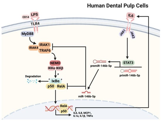 A schematic graph illustrating the role of miR-146b-5p in LPS-stimulated hDPCs. LPS binds to TLR4 thus activating the NF-κB signaling pathway and resulting in the synthesis of pro-inflammatory cytokines IL6, IL8, MCP1, IL1α, IL1β, and TNFα. Generally, IL6 further initiates JAK/STAT3 signaling, which is responsible to generate mature miR-146b-5p. miR-146b-5p, in turn, negatively regulates the NF-κB signaling pathway by targeting TRAF6, IRAK1, and RELA. The same phenomena were confirmed in LPS-applied rat dental pulp tissues ex vivo. Created with BioRender.com.