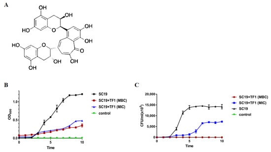 TF1 antibacterial activity. (A) Chemical structure of TF1. (B) Kinetics of the killing activity of TF1 against SC19 were monitored by OD600nm at the indicated times. (C) Kinetics of the killing activity of TF1 against SC19 were monitored by CFU counts at the indicated times.