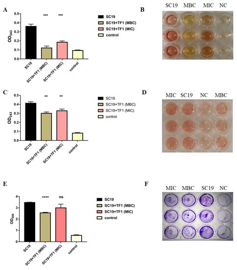 As shown in Figure 3E,F, two different doses of TF1 were tested against SC19 biofilm formation. At MBC of TF1, there was significant inhibition (p < 0.0001) of S. suis biofilm formation, but it had no effect at MIC (p > 0.05), suggesting that 2048 µg/mL was more effective than 512 µg/mL at inhibiting biofilm formation.